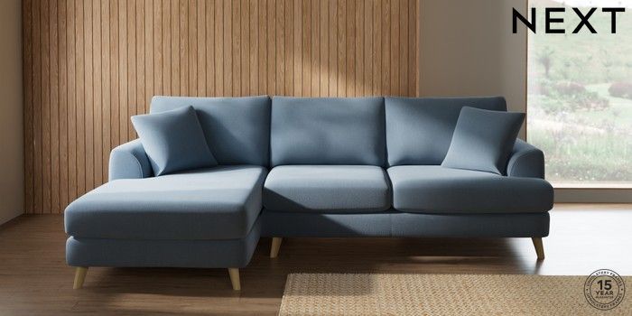 7.2.10 Buy Parker Medium Sofa Chaise - Left Hand Relaxed Linen Look Mid Blue Low Retro Tapered - Light from the Next UK online shop Click here to use our accessible website