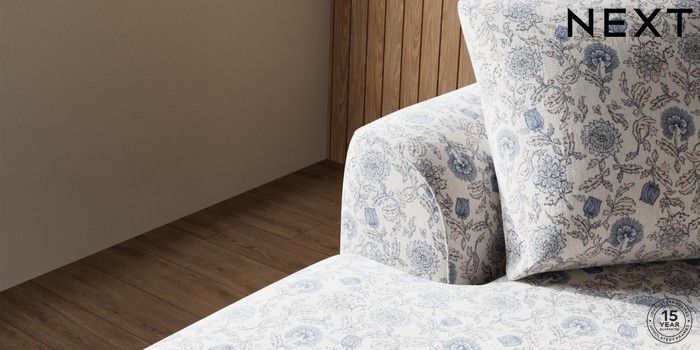 7.3.1 Buy Parker Medium Sofa Chaise - Left Hand Relaxed Linen Look Print Woodblock Floral Blue Low Retro Tapered - Dark from the Next UK online shop Click here to use our accessible website