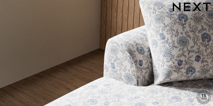 7.3.1 Buy Parker Medium Sofa Chaise - Left Hand Relaxed Linen Look Print Woodblock Floral Blue Low Retro Tapered - Mid from the Next UK online shop Click here to use our accessible website