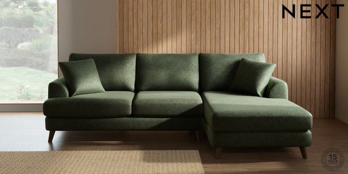 7.2.10 Buy Parker Medium Sofa Chaise - Right Hand Boucle Chenille Dark Moss Green Low Retro Tapered - Mid from the Next UK online shop Click here to use our accessible website