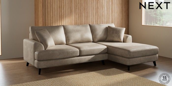 7.2.4 Buy Parker Medium Sofa Chaise - Right Hand Plush Chenille Light Natural Low Retro Tapered - Dark from the Next UK online shop Click here to use our accessible website
