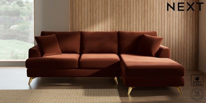 7.3.1 Buy Parker Medium Sofa Chaise - Right Hand Plush Velvet Easy Clean Ginger Orange High Metal - Brass from the Next UK online shop Click here to use our accessible website