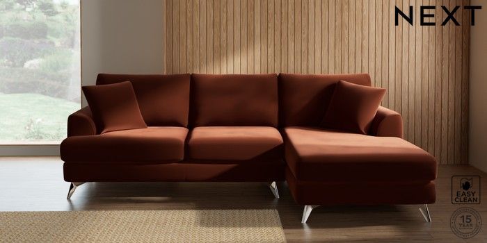 7.3.1 Buy Parker Medium Sofa Chaise - Right Hand Plush Velvet Easy Clean Ginger Orange High Metal - Chrome from the Next UK online shop Click here to use our accessible website