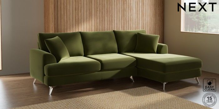 7.2.5 Buy Parker Medium Sofa Chaise - Right Hand Plush Velvet Easy Clean Mid Olive Green High Metal - Chrome from the Next UK online shop Click here to use our accessible website