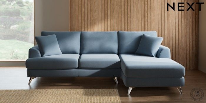 7.2.10 Buy Parker Medium Sofa Chaise - Right Hand Relaxed Linen Look Mid Blue High Metal - Chrome from the Next UK online shop Click here to use our accessible website