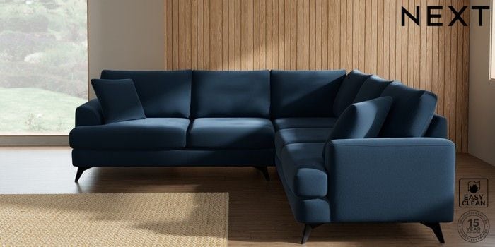7.2.10 Buy Parker Medium Corner Sofa - Universal Plush Velvet Easy Clean Airforce Blue High Metal - Black from the Next UK online shop Click here to use our accessible website