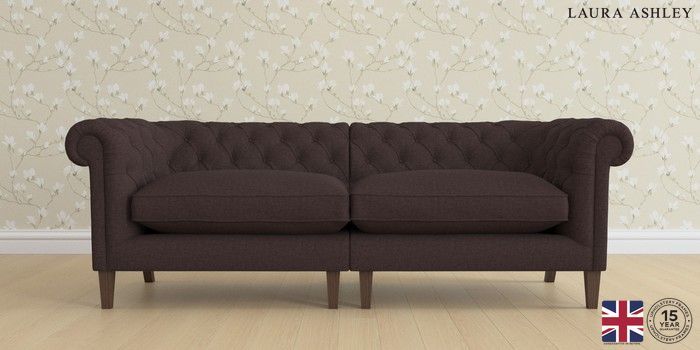 The Laura Ashley Penarth is a signature deep sit curved sofa in the Chesterfield style. Featuring gently scrolled, wide arms, matching the height of the back of the sofa, combined with deep seat cushions filled with foam core and fibre wrap interiors, this sofa is perfect for relaxing in. Elegant, tapered show wood legs with brass or chrome castors complete the traditional, classic style.