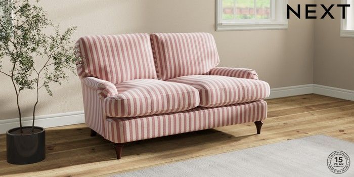 7.0.3 Buy Sadie Deep Relaxed Sit 2 Seater Small Sofa Bold Chenille Stripe Dark Pink High Slim Turned - Dark Brown from the Next UK online shop Click here to use our accessible website