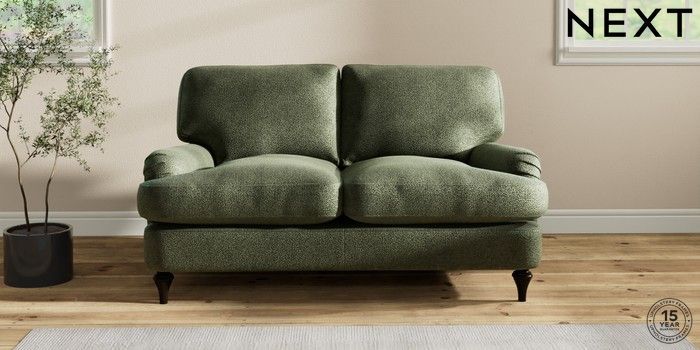 6.12.1 Buy Sadie Deep Relaxed Sit 2 Seater Small Sofa Boucle Chenille Dark Moss Green High Slim Turned - Dark from the Next UK online shop Click here to use our accessible website