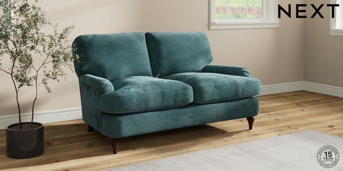 7.0.3 Buy Sadie Deep Relaxed Sit 2 Seater Small Sofa Chunky Chenille Mid Teal Green High Slim Turned - Dark Brown from the Next UK online shop Click here to use our accessible website