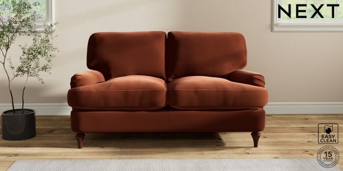 6.12.1 Buy Sadie Deep Relaxed Sit 2 Seater Small Sofa Plush Velvet Easy Clean Ginger Orange High Slim Turned - Dark Brown from the Next UK online shop Click here to use our accessible website