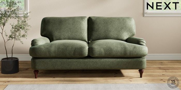 6.12.1 Buy Sadie Deep Relaxed Sit 2 Seater Sofa Boucle Chenille Dark Moss Green High Slim Turned - Dark Brown from the Next UK online shop Click here to use our accessible website
