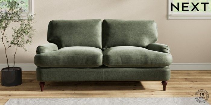 6.12.1 Buy Sadie Deep Relaxed Sit 2 Seater Sofa Luxe Chenille Mid Green High Slim Turned - Dark Brown from the Next UK online shop Click here to use our accessible website