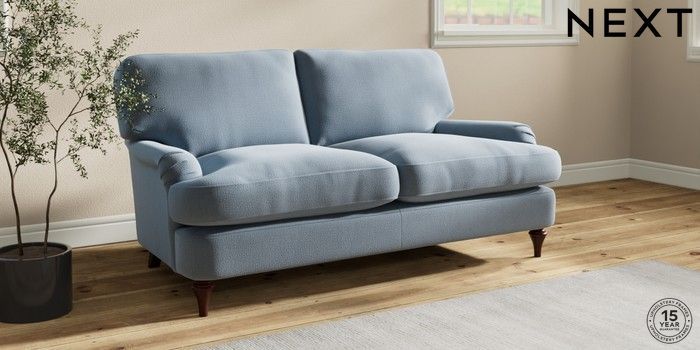 7.0.3 Buy Sadie Deep Relaxed Sit 2 Seater Sofa Relaxed Linen Look Mid Blue High Slim Turned - Dark Brown from the Next UK online shop Click here to use our accessible website