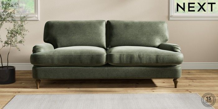 6.12.1 Buy Sadie Deep Relaxed Sit 3 Seater Sofa Luxe Chenille Mid Green High Slim Turned - Mid from the Next UK online shop Click here to use our accessible website