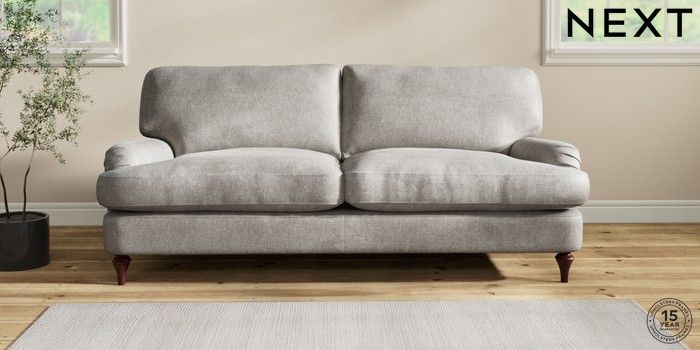 6.12.1 Buy Sadie Deep Relaxed Sit 3 Seater Sofa Plush Chenille Light Grey High Slim Turned - Dark Brown from the Next UK online shop Click here to use our accessible website