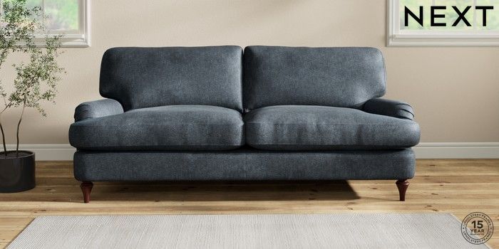 6.12.1 Buy Sadie Deep Relaxed Sit 3 Seater Sofa Plush Chenille Slate Blue High Slim Turned - Dark Brown from the Next UK online shop Click here to use our accessible website