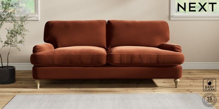 6.12.1 Buy Sadie Deep Relaxed Sit 3 Seater Sofa Plush Velvet Easy Clean Ginger Orange High Slim Turned - Light from the Next UK online shop Click here to use our accessible website