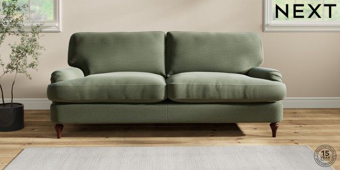 6.12.1 Buy Sadie Deep Relaxed Sit 3 Seater Sofa Relaxed Linen Look Dark Green High Slim Turned - Dark Brown from the Next UK online shop Click here to use our accessible website