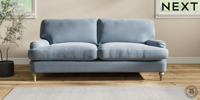 6.12.1 Buy Sadie Deep Relaxed Sit 3 Seater Sofa Relaxed Linen Look Mid Blue High Slim Turned - Light from the Next UK online shop Click here to use our accessible website