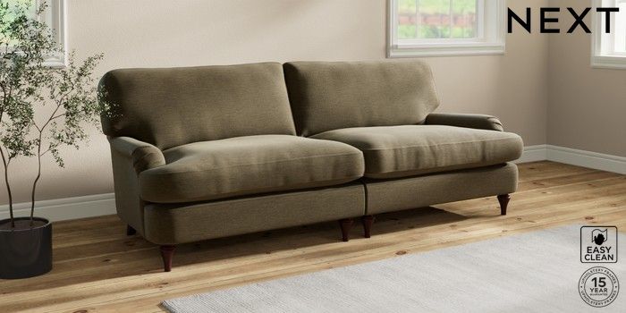 7.0.3 Buy Sadie Deep Relaxed Sit 4 Seater Sofa Fine Chenille Easy Clean Dark Moss Green High Slim Turned - Dark Brown from the Next UK online shop Click here to use our accessible website