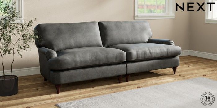 7.0.3 Buy Sadie Deep Relaxed Sit 4 Seater Sofa Monza Faux Leather Easy Clean Dark Grey High Slim Turned - Dark Brown from the Next UK online shop Click here to use our accessible website