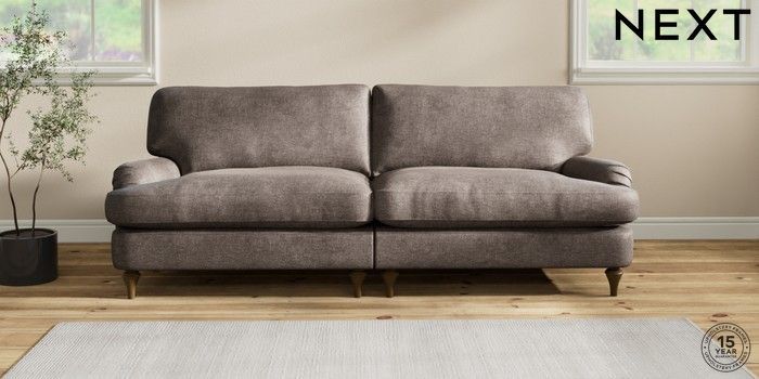 6.12.1 Buy Sadie Deep Relaxed Sit 4 Seater Sofa Plush Chenille Mink Brown High Slim Turned - Mid from the Next UK online shop Click here to use our accessible website
