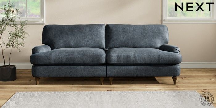6.12.1 Buy Sadie Deep Relaxed Sit 4 Seater Sofa Plush Chenille Slate Blue High Slim Turned - Mid from the Next UK online shop Click here to use our accessible website
