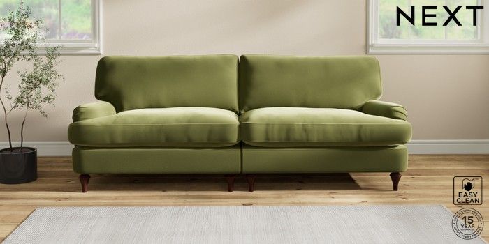6.12.1 Buy Sadie Deep Relaxed Sit 4 Seater Sofa Plush Velvet Easy Clean Mid Olive Green High Slim Turned - Dark Brown from the Next UK online shop Click here to use our accessible website
