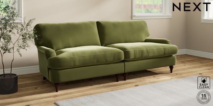 7.0.3 Buy Sadie Deep Relaxed Sit 4 Seater Sofa Plush Velvet Easy Clean Mid Olive Green High Slim Turned - Dark Brown from the Next UK online shop Click here to use our accessible website