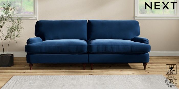6.12.1 Buy Sadie Deep Relaxed Sit 4 Seater Sofa Plush Velvet Easy Clean Navy Blue High Slim Turned - Dark Brown from the Next UK online shop Click here to use our accessible website