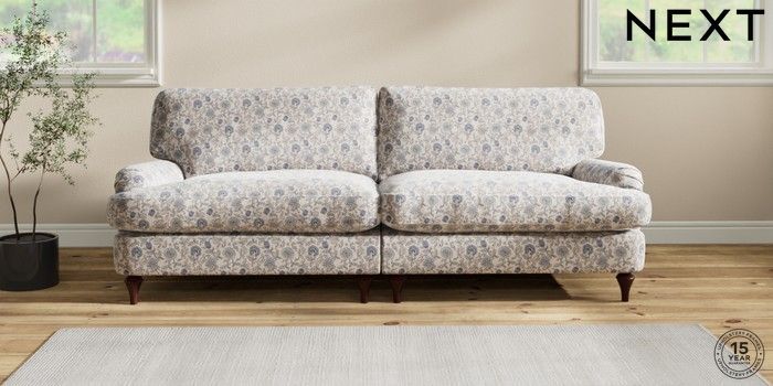 7.2.6 Buy Sadie Deep Relaxed Sit 4 Seater Sofa Relaxed Linen Look Print Woodblock Floral Blue High Slim Turned - Dark Brown from the Next UK online shop Click here to use our accessible website