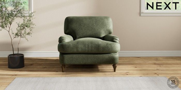 6.12.1 Buy Sadie Deep Relaxed Sit Armchair Boucle Chenille Dark Moss Green High Slim Turned - Mid from the Next UK online shop Click here to use our accessible website