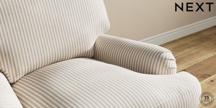 7.0.3 Buy Sadie Deep Relaxed Sit Armchair Chenille Stripe Natural High Slim Turned - Dark Brown from the Next UK online shop Click here to use our accessible website