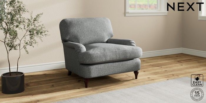7.0.3 Buy Sadie Deep Relaxed Sit Armchair Chunky Boucle Easy Clean Mid Grey High Slim Turned - Dark Brown from the Next UK online shop Click here to use our accessible website
