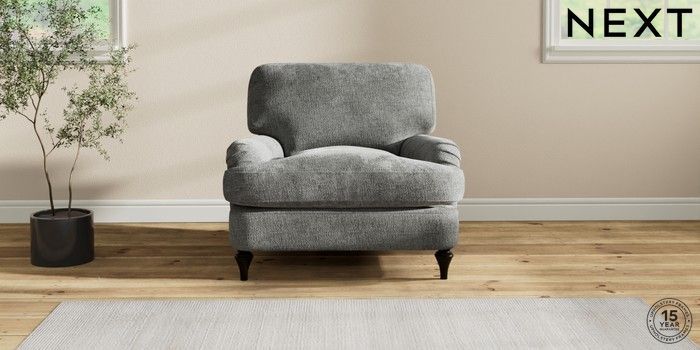6.12.1 Buy Sadie Deep Relaxed Sit Armchair Chunky Chenille Dark Grey High Slim Turned - Dark from the Next UK online shop Click here to use our accessible website