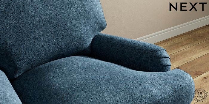 7.0.3 Buy Sadie Deep Relaxed Sit Armchair Cotswold Chenille Dark Blue High Slim Turned - Dark Brown from the Next UK online shop Click here to use our accessible website