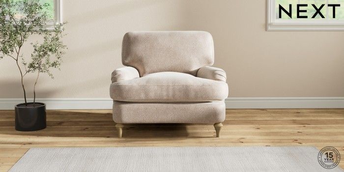 6.12.1 Buy Sadie Deep Relaxed Sit Armchair Cotswold Chenille Light Natural High Slim Turned - Light from the Next UK online shop Click here to use our accessible website