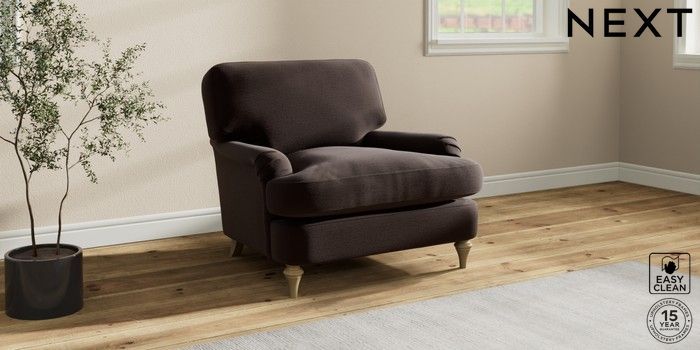 7.0.3 Buy Sadie Deep Relaxed Sit Armchair Fine Chenille Easy Clean Chocolate Brown High Slim Turned - Light from the Next UK online shop Click here to use our accessible website