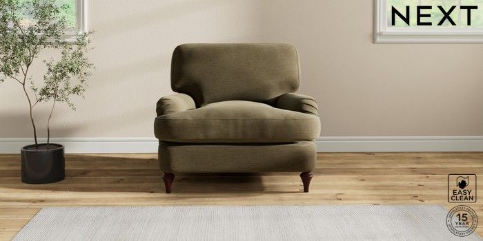 6.12.1 Buy Sadie Deep Relaxed Sit Armchair Fine Chenille Easy Clean Dark Moss Green High Slim Turned - Dark Brown from the Next UK online shop Click here to use our accessible website