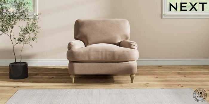 6.12.1 Buy Sadie Deep Relaxed Sit Armchair Luxe Chenille Mid Natural High Slim Turned - Light from the Next UK online shop Click here to use our accessible website