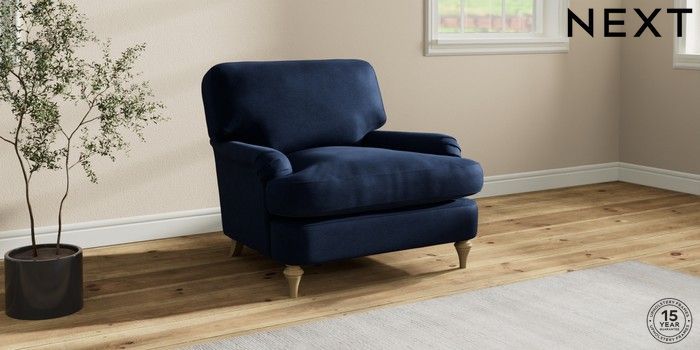 7.0.3 Buy Sadie Deep Relaxed Sit Armchair Luxe Chenille Navy Blue High Slim Turned - Light from the Next UK online shop Click here to use our accessible website