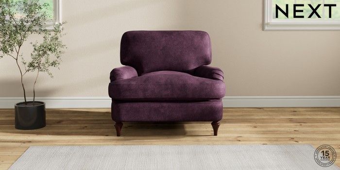 6.12.1 Buy Sadie Deep Relaxed Sit Armchair Plush Chenille Dark Plum Purple High Slim Turned - Dark Brown from the Next UK online shop Click here to use our accessible website