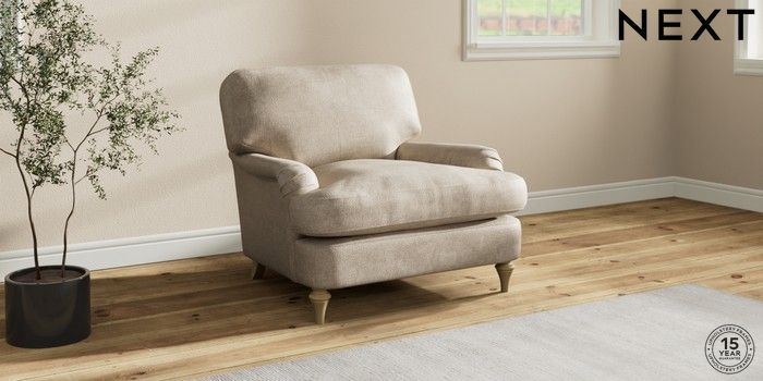 7.0.3 Buy Sadie Deep Relaxed Sit Armchair Plush Chenille Light Natural High Slim Turned - Light from the Next UK online shop Click here to use our accessible website