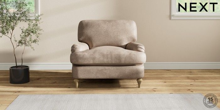 6.12.1 Buy Sadie Deep Relaxed Sit Armchair Plush Chenille Mid Natural High Slim Turned - Light from the Next UK online shop Click here to use our accessible website