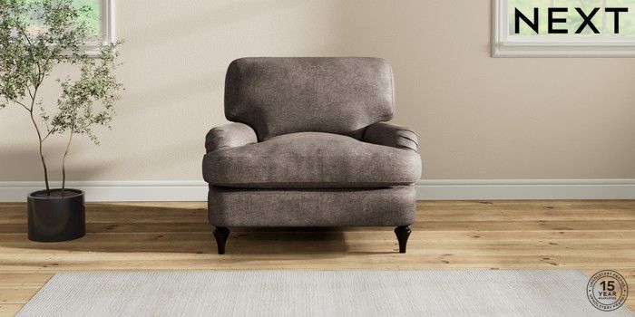 6.12.1 Buy Sadie Deep Relaxed Sit Armchair Plush Chenille Mink Brown High Slim Turned - Dark from the Next UK online shop Click here to use our accessible website