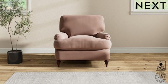 6.12.1 Buy Sadie Deep Relaxed Sit Armchair Plush Velvet Easy Clean Mid Natural High Slim Turned - Dark Brown from the Next UK online shop Click here to use our accessible website
