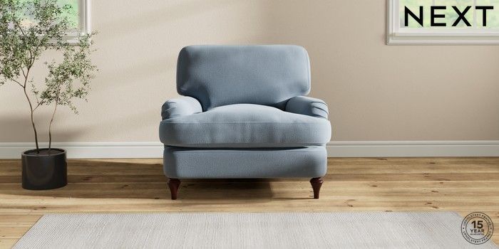 6.12.1 Buy Sadie Deep Relaxed Sit Armchair Relaxed Linen Look Mid Blue High Slim Turned - Dark Brown from the Next UK online shop Click here to use our accessible website