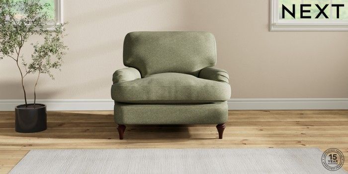6.12.1 Buy Sadie Deep Relaxed Sit Armchair Tweedy Chenille Mid Moss Green High Slim Turned - Dark Brown from the Next UK online shop Click here to use our accessible website