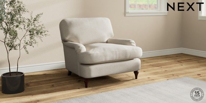 7.0.3 Buy Sadie Deep Relaxed Sit Armchair Tweedy Chenille Oyster High Slim Turned - Dark Brown from the Next UK online shop Click here to use our accessible website